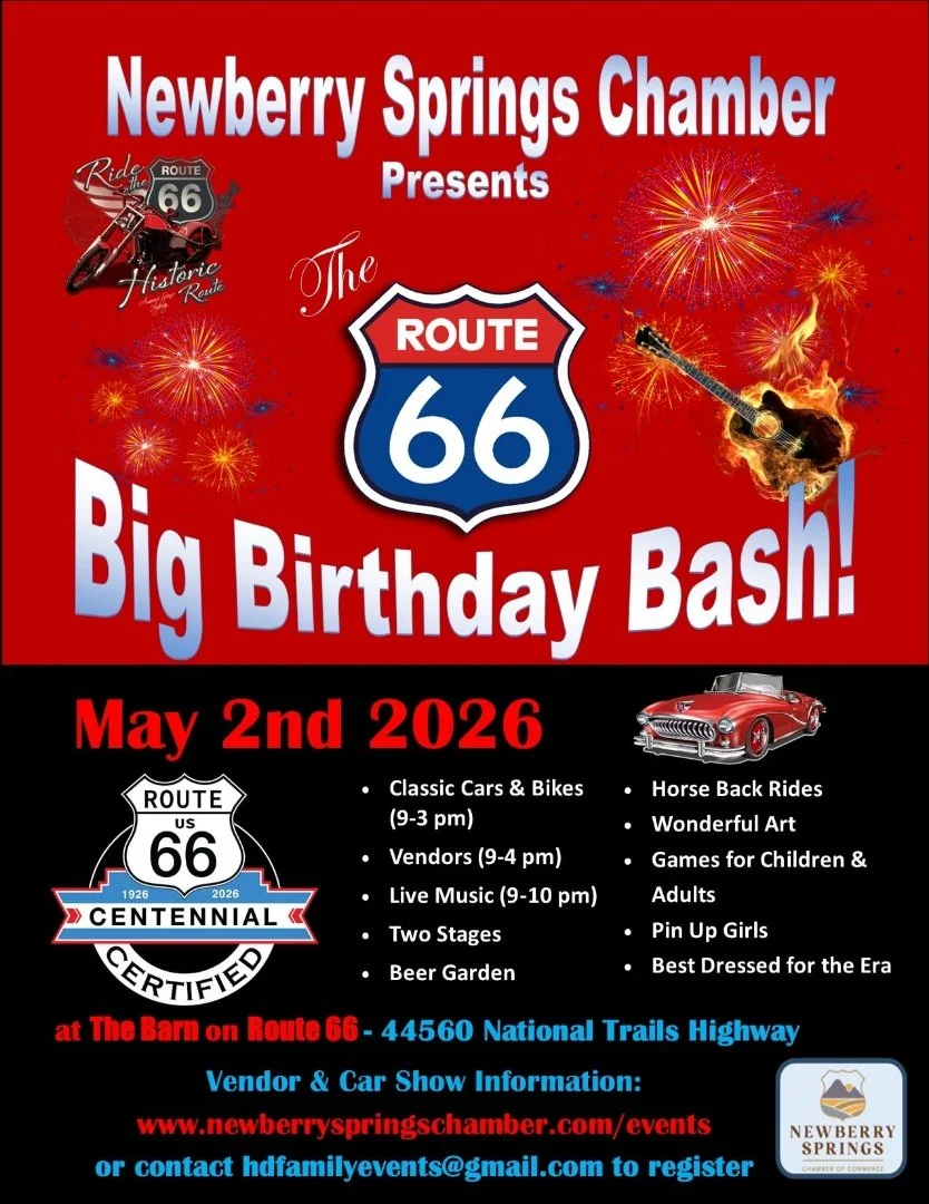 Back to All Events Route 66 Big Birthday Bash Meeting Thursday, March 26, 2026 5:00 PM 7:00 PM The Barn - Route 66 44560 National Trails Highway Newberry Springs, CA, 92365 United States (map) Google Calendar ICS